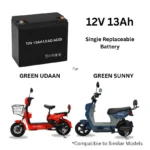- 12V 13AH Capacity: Specifically designed for Green Udaan & Sunny Electric Scooter or compatible similar models. 12V means 1 battery of 13Ah. If scooter has 4 batteries then replace with any faulty 1 battery. Do not interchange otherwise scooter will not work. For clarity whatsapp us at our support number. We will guide you before purchase.