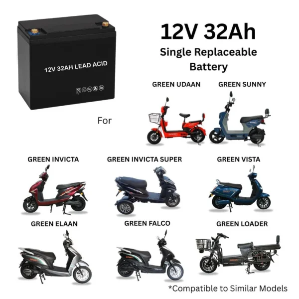 - 12V 32AH Capacity: Specifically designed for Green UGreen Udaan Sunny Invicta & Invicta Super Vista Elaan Falco Loader Electric Scooter or compatible similar models. 12V means 1 battery of 32Ah. If scooter has 4 or 5 batteries then replace with any faulty 1 battery. Do not interchange otherwise scooter will not work. For clarity whatsapp us at our support number. We will guide you before purchase.