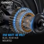 - Powerful Motor & Large Wheels: The GREEN electric scooter boasts a powerful 250W rear-wheel drive motor and large 10 inch” wheels, which can handle even the bumpiest of roads with ease, and can help you reach speeds of up to 25km/hr. The pneumatic tires are tough enough to handle just about any situation, and the scooter’s durable one-piece wheel hubs and high-strength steel frame make it strong enough to support riders up to 2.